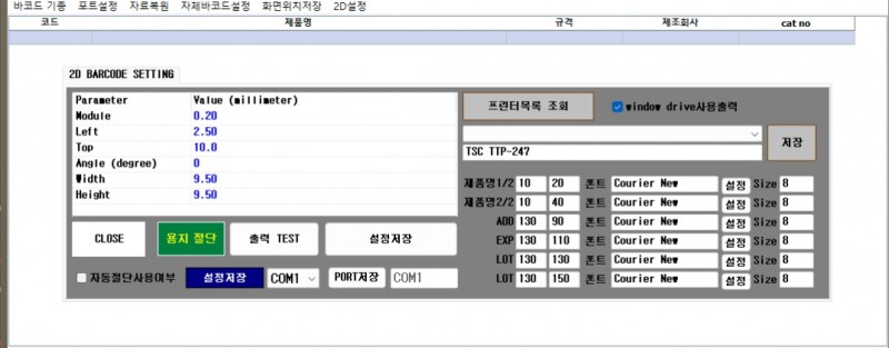 바코드 출력 설정 작성자 최고관리자 / 2025-08-26 23:44 / 조회178회 관련링크 본문 그림처럼 동일하게 세팅..메뉴중 -> 2D설정 클릭후 아래처럼 설정자동절단 설정은 장비가 설치된 경우만 사용 가능** window driver가 설치되어있어여야 함 (50*25로 설정해야 함) 목록